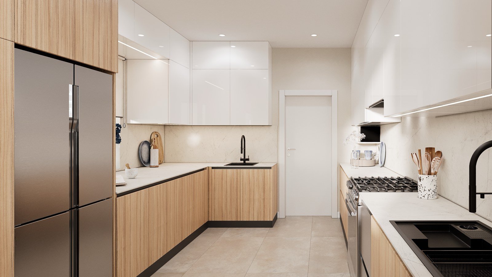 For the countertop, we selected premium Italian HPL from Puricelli, combining durability with refined aesthetics. The cabinetry features a beautiful combination of Cream Soft Touch fronts and warm wood textures, creating a soft, elegant, and inviting atmosphere.